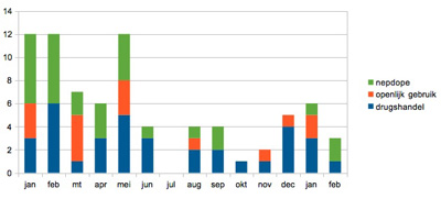 Drugsgerelateerde incidenten Amsterdam Oost 01/14 - 02/15 Cijfers: Gemeente Amsterdam, Grafiek: Wij Verdienen Beter